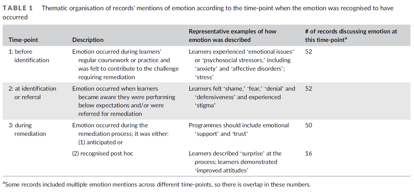 Because an investigation of emotion was not an explicitly stated goal for any of the records we reviewed, some educators may consider emotion in ways not documented in their publications; still, the relatively small emphasis on emotion in this body of literature suggests that explicit attention to emotion in remediation programme design may be a gap. The greater number of emotion mentions at Time-points 1 and 2, compared with 3, indicates that the authors' awareness of emotion (as a cause of challenges or related to being referred for remediation) is not matched by a purposeful inclusion of emotion into the design of remediation programmes. Despite the fact that many authors frequently recognised emotions that struggling learners experience, there is not yet commensurate attention on the importance of, or practical guidance for, incorporating emotions into remediation practice.