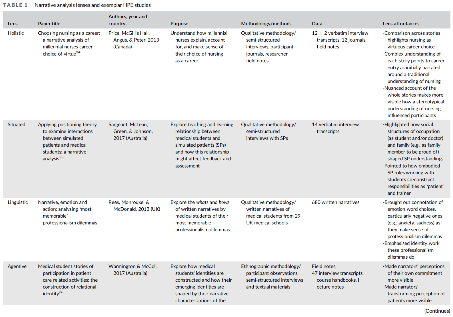 HPE연구의 네러티브 분석의 잠재력: 다섯 개의 분석적 렌즈(Med Educ, 2021)