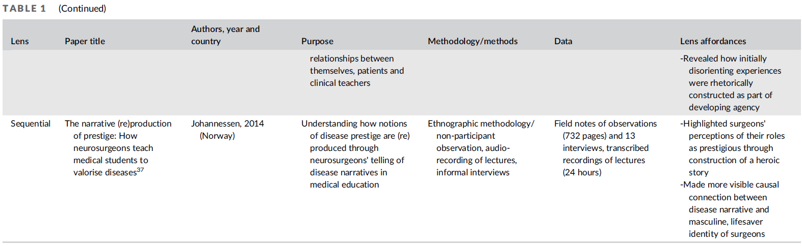 For example, in Johannessen's study of disease prestige in neurosurgeons' narratives, he argued that the sequence of events in these narratives—rupture, diagnostics, treatment and return to normality—mirrored heroic stories with a strong masculine hero in Western culture (see Table 1).37 In this case, the sequential lens revealed a particular type of story structure, offering insight into how those neurosurgeons conceived of their actions and consequences, building prestige for their identity as neurosurgeons.37