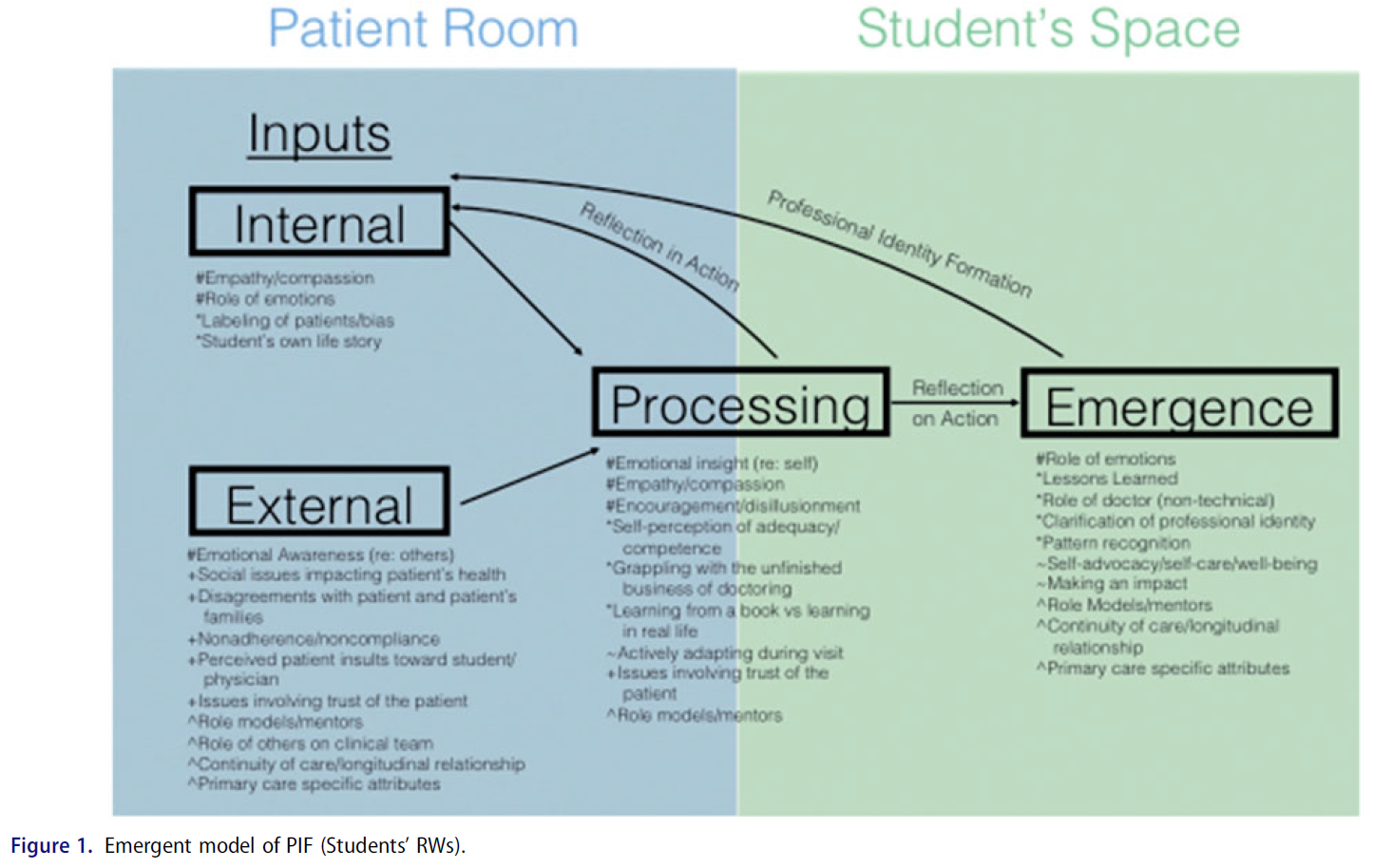 의학 교육의 기본 목표는 직업 정체성 형성(PIF)의 적극적이고 건설적이며 변화적인 과정이다. PIF는 "자아의 표현으로, 직업의 특성, 가치, 규범이 시간에 따라 내재화되면서 단계적으로 달성되며, 결과적으로 개인의 의사로서의 생각하고, 행동하고, 느끼게 한다." 의료 교육자는 학습자의 복잡하고 반복적인 PIF 프로세스를 지원하는 커리큘럼을 설계하여 성찰적이고 휴머니즘적이며 탄력적인 의료 전문가의 구성을 촉진한다(Wald 등 2015). 이와 같이, 우리는 PIF의 진화하는 프로세스(Fins et al. 2003) 내에서, 그리고 연습의 복잡함 내에서 수용 가능한 행동 과정과 "존재"의 방식에 대해 가치 중심의 선택을 하기 위한 도덕적 행위자(Pellegrino 1987)로서 학습자를 준비하고 "강화"하는 것을 목표로 한다(Bryan).nd Babelay 2009). 「실천적 지혜」를 육성하는 메타인식과 메타감정적 스킬을 가지는 성찰적인 프로의 자아를 개발하는 것은, 건강한 PIF 프로세스를 서포트하는 것으로, 전문직 역량의 핵심입니다(Wald and Reis 2010). PIF 프로세스의 핵심 추진 요소로서의 경험에서 학습하기 위한 가이드된 성찰은 전문 지식과 가치의 의미 있는 조합을 배양하는 데 도움이 됩니다(Rabow et al. 2010).
