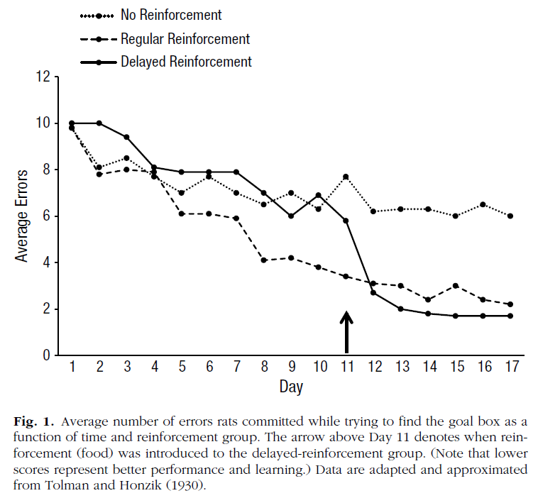 Blodgett(1929년), Tolman(1930년)과 Honzik(1930년)에 의해 처음 입증되었지만, 그 결과는 학습과 기억력에 관한 대부분의 교과서에 보고되어 있는 잠복 학습에 대한 고전적인 실험으로 여겨지고 있다. 본질적으로 Blodgett의 복제인 그들의 실험에서, 세 그룹의 쥐들은 총 17일 동안 매일 복잡한 T-maze에 놓였습니다. 한 그룹의 쥐는 골 박스에 도달하기 위해 강화되지 않았습니다.골 박스에 도달할 때마다 다른 그룹은 음식으로 강화되었습니다. 세 번째 그룹은 11일째까지 골대에 도달한 것에 대해 보상을 받지 못했으며, 그 후 정기적으로 보상을 받았다. 이 실험의 결과는 그림 1과 같다. 당연하게도 17일 동안 골박스 찾기에서 오류가 가장 적은 그룹은 정규 강화 그룹이었고, 강화되지 않은 그룹은 오류가 가장 많았다. 잠재 학습의 개념과 일관되게, 지연 강화 그룹은 즉각적인 개선이 발생한 11일째(식품이 도입된 날)까지 단 한 번도 강화하지 않은 그룹과 동일한 오류 수를 보였으며, 오류율은 정규 강화 그룹과 비슷한 수준으로 떨어졌다. 따라서, 보강을 늦추는 것은 쥐들이 실제로 보강이 이루어지지 않은 상태에서 미로를 배운다는 것을 드러냈고 그들의 행동은 오히려 목적 없는 것처럼 보였다. 수행은 정체된 상태로 학습이 이뤄졌다는 얘기다.