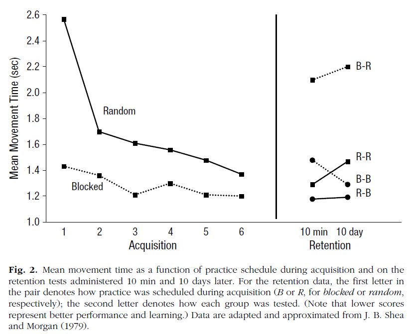 J. B. Shea와 Morgan(1979)은 또한 운동 기술을 장기간 유지하는 데 도움이 된다는 것을 보여주었다. 그들의 중요한 실험에서, 참가자들은 세 가지 다른 움직임 패턴을 배웠는데, 각각의 움직임에는 정해진 순서에 따라 세 개의 작은 나무 장벽(6개 중 한 개)을 넘어뜨리는 것이 포함되었습니다. 두 가지 다른 연습 일정, 즉 차단과 랜덤이 구현되었습니다. 블록 프랙티스 조건에서는 3가지 동작 패턴 각각이 18회 연속적으로 연습된 반면 랜덤 프랙티스 조건에서는 참가자의 입장에서 예측할 수 없는 방식으로 각 패턴의 18회 동작이 다른 패턴에 대한 시험 사이에 혼재되었다. 따라서 중요한 것은 세 가지 작업에 대한 연습 시간이 두 가지 다른 연습 조건에 걸쳐 동일하다는 것이다. 관심사는 서로 다른 연습 일정이 팔 움직임이 실행되는 속도에 어떻게 영향을 주느냐였다.