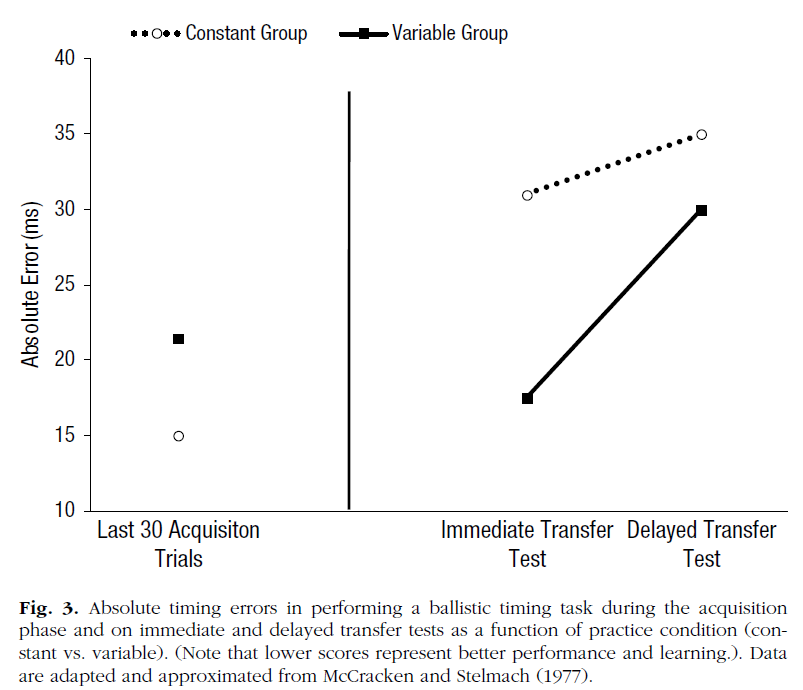 In their important article, Kerr and Booth (1978) provided compelling evidence that varying the conditions of practice, as opposed to keeping them fixed, can boost long-term learning of a motor skill. In their study, children tossed beanbags at a target on the floor from distances of 2 and 4 feet (varied practice) or only 3 feet (fixed practice). After a delay, all participants were tested from a distance of 3 feet, the sole distance practiced by participants in the fixed-practice group. Intuition would suggest that participants in the fixed-practice group, who exclusively practiced from the tested distance, would do better than those in the varied-practice group, who never practiced at the tested distance. The results, however, showed the opposite pattern: Varying the practice distances led to more accurate tosses from 3 feet away on the final test, showcasing the benefits of variable practice in producing transfer of a motor skill, a result that has been replicated and extended (e.g., Pigott & Shapiro, 1984; Roller, Cohen, Kimball, & Bloomberg, 2001; Wulf, 1991).