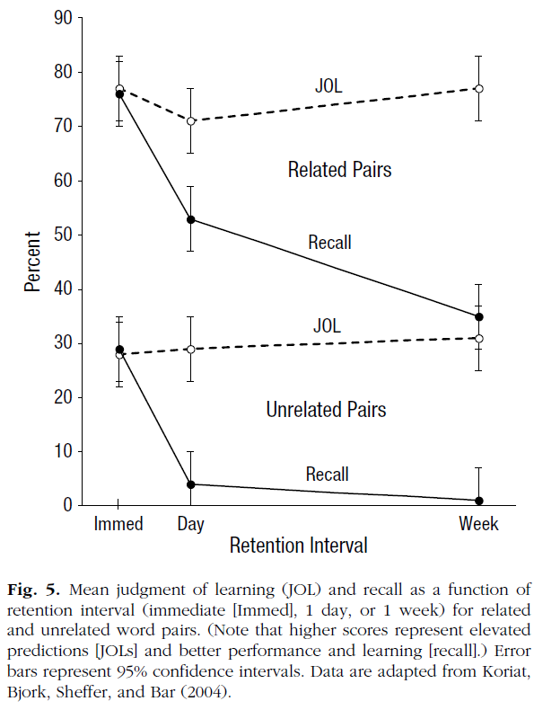 Generally speaking, learners tend to be overconfident in predicting their own learning and regularly exhibit what has been termed the stability bias, which refers to the tendency to believe that current accessibility of retrieved information (i.e., performance) will remain stable across time, rather than appreciating those factors that may impair or enhance later learning (Kornell & Bjork, 2009; see also Ariel, Hines, & Hertzog, 2014; Kornell, 2011). In a study that demonstrated a particularly striking example of a stability bias, participants studied related and unrelated word pairs, making JOLs after each item. Separate groups of participants were asked to base their predictions on how well they would remember the pairs on an immediate test, a test after 1 day, or a test after 1 week. As illustrated in Figure 5, participants produced a pattern of results demonstrating apparent insensitivity to retention interval—specifically, equivalent JOLs were given across the three retention intervals. However, and as expected, actual recall decreased as a function of retention interval. Also evident in Figure 5 is that JOLs were highly sensitivity to the relatedness of the word pairs, which led the authors to conclude that encoding fluency, or how easily information is processed during study, can largely drive JOLs (Koriat et al., 2004; see also Begg, Duft, Lalonde, Melnick, & Sanvito, 1989; Koriat, 2008; Undorf & Erdfelder, 2011; for an alternative account, see Mueller, Tauber, & Dunlosky, 2013), even at the expense of other extremely relevant information—in this case, retention interval.