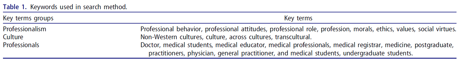 Results: Out of 143 articles on medical professionalism, only four studies provided three structured professionalism frameworks in non-Western contexts. Medical professionalism attributes in non-Western cultures were influenced by cultural values. Out of the 24 identified attributes of professionalism, 3 attributes were shared by the three cultures. Twelve attributes were shared by at least two cultures, and the rest of the attributes were unique to each culture.