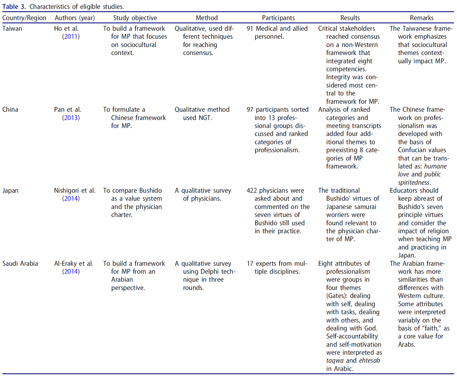 144개의 전문이 추가 검토를 위해 최종 후보 명단에 올랐으며, 131개의 연구는 비의료 전문성에 중점을 두었기 때문에 제외되었다. 비서양 문화에서 전문직업성을 다룬 기사는 13건뿐이었다. 이 13개 연구 중 [오직 4개 연구]만이 문화 특이적 요소를 포함하는 독특한 비서구적 프레임워크를 가지고 있었다. 이 네 가지 연구로부터 오직 세 개의 다른 프레임워크만이 중국어로 확인되었고 대만 연구는 둘 다 하나의 프레임워크에 초점을 맞추고 있었다. 표 3은 포함된 연구의 특성을 보여준다. 상자 1 ~ 3은 세 가지 프레임워크를 설명합니다. 다른 9개의 연구는 서양의 관점을 통해 전문성을 보기 때문에 제외되었다. 표 4는 3개의 비서양 문화에서 발견된 24개의 속성을 보여줍니다. 3개의 프레임워크에서 공통되는 속성은 3개뿐이며, 12개의 속성은 적어도 2개의 문화에서 공유됩니다. 나머지 9가지 속성은 각 문화마다 고유하다. 즉, 적어도 하나의 문화에서 발견된다.