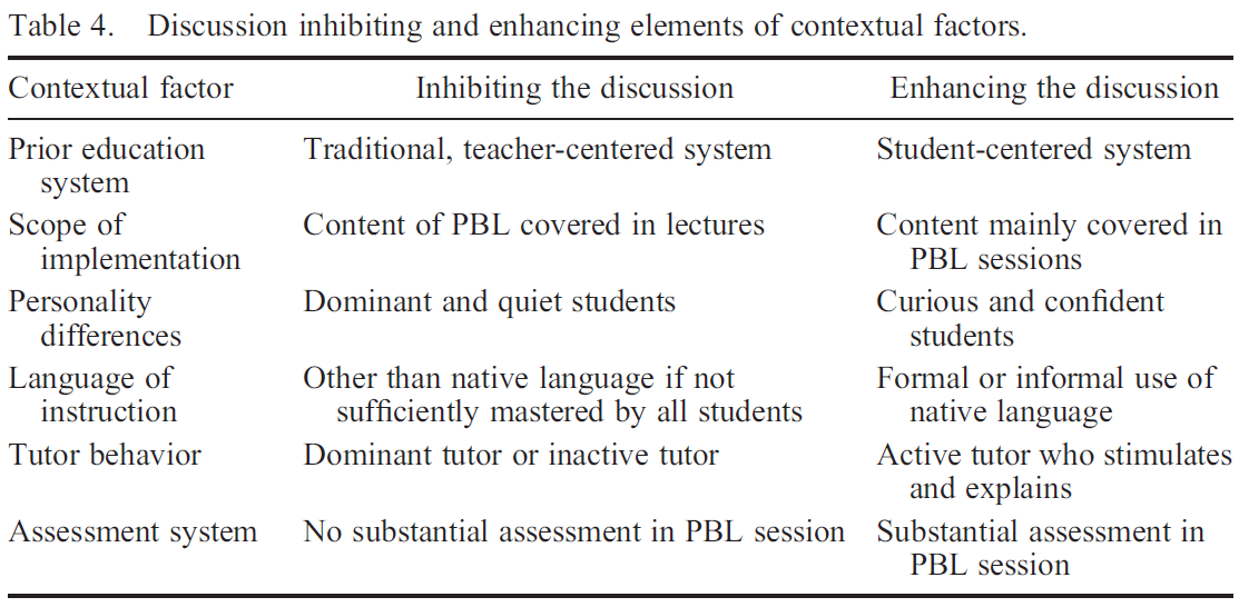 - the importance of the scope of PBL implementation, personality differences between students, the assessment system, and the major mediating role of the tutor in discussion sessions (Dochy et al. 2003; Dolmans et al. 2005; Moust, Van Berkel, and Schmidt 2005).