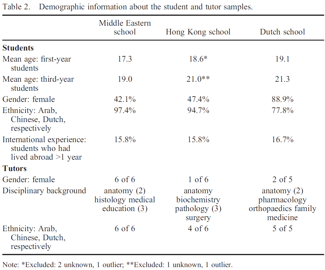 표 1은 3개 학교의 PBL 측면을 몇 가지 나열한 것입니다. 설립 이래, 네덜란드와 중동의 학교에서는, PBL을 학부시절의 주요한 교육 방법으로 사용해, 교사 중심의 강의는 비교적 적었습니다. 홍콩학교는 1990년대 PBL을 전통적인 교사 중심의 교육과정에서 학생 중심의 교육과정으로 전환하는 것을 목표로 전반적인 교육과정 개혁의 일환으로 시행했다. 이 개혁으로 인해 강의 기반과 PBL이 혼재된 커리큘럼이 탄생했습니다.
