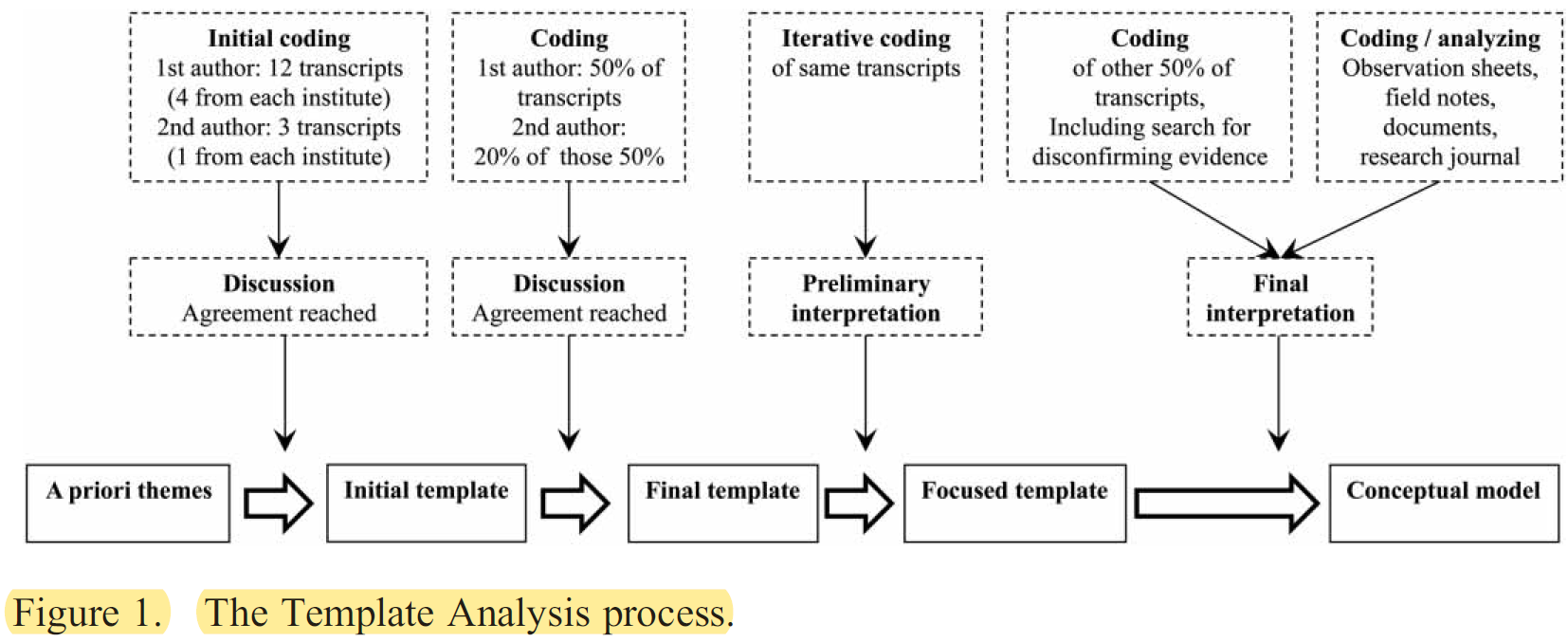 특정 단계별 주제 분석 유형인 템플릿 분석을 사용하여 데이터를 분석하였다(King 2004, 2010). Template Analysis에서는 [계층적으로 구조화된 테마로 구성된 일련의 코딩 템플릿]을 개발하여, 데이터에 반복적으로 적용하는 과정에서 [분석 진행에 따라 테마가 지속적으로 변경]된다. 그림 1은 다양한 템플릿과 관련 단계를 보여줍니다. 우선, 연구진은 학생들이 토론 세션에서 겪는 어려움이나 세션에 대처하기 위해 개발한 전략과 같이 분석에서 식별될 것으로 예상되는 선험적인 주제를 공식화했다. 첫 번째와 두 번째 저자는 인터뷰 녹취록의 하위 샘플을 이러한 주제로 독립적으로 코드화했다. 이 과정에서 새로운 주제를 식별하고, 기존 주제를 수정하고, 중복된 주제를 삭제했다. 코딩은 정성 데이터 분석용 소프트웨어 프로그램인 Atlas.ti 버전 6.2를 사용하여 수행되었습니다. 두 저자는 토론을 통해 주제 발생 및 해석에 대한 합의를 이룬 후 인터뷰 성적서의 절반에 적용되는 초기 코딩 템플릿을 개발했다.