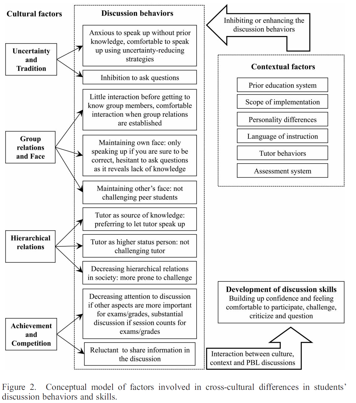 In addition to cultural factors, six mediating contextual factors were identified that, depending on their nature, either inhibited or enhanced students' discussion behaviors. While the distinction between cultural and other contextual factors was sometimes hard to make considering the interrelatedness of all factors, these six factors related more to either organizational decisions or individual characteristics rather than culture. In the three institutions alike, the nature of the secondary school system, the scope of PBL implementation, students' personalities, language of instruction, the behavior of tutors, and the assessment system were found to impact on the discussions.