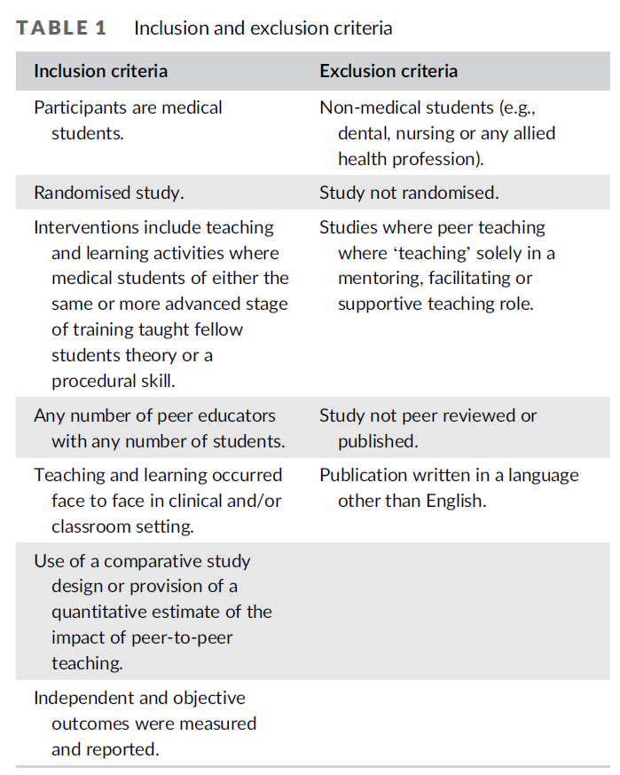 This study systematically reviewed all randomised studies of PAL conducted using medical students as subjects. The principal aim was to establish the effectiveness of PAL, choosing academic performance as a proxy measure. The secondary aims focus on identifying the specific medical education setting where PAL may add value. We set out to identify any differences between the performance of preclinical and clinical students, the teaching of procedural skills or theoretical knowledge, and the impact of PAL on academic achievement between groups when assessed in the medium to longer term.