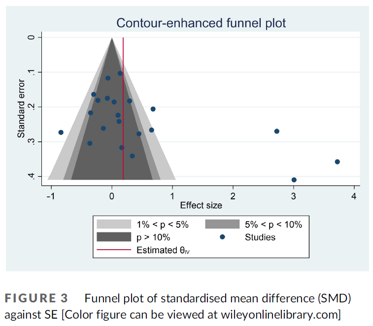 포함된 연구의 편향 위험은 그림 2에 요약되어 있다. 12개 연구는 무작위화 방법을 보고하지 않았으며, 24개 연구는 배분이 은폐되었는지 여부를 명확하게 기록하지 못했다. 실험 참가자들의 눈을 멀게 하는 연구는 없었다. 9개의 연구에서 블라인딩에 대한 불충분한 정보가 제공되었지만, 검토된 대부분의 연구에서 검출 편향이 여전히 낮았다. 과반수는 모든 결과 데이터를 보고했고, 따라서 낮은 소모attrition 편향을 보였으며, 4개의 연구는 최종 분석에서 참가자가 제외되었기 때문에 보고 편향이 높았다. 그림 3에서 볼 수 있는 SMD의 깔때기 그림은 유의한 비대칭을 나타내며, 이는 연구가 결합된 효과 크기에 대해 대칭적으로 분포되지 않기 때문에 출판 편향을 시사한다.