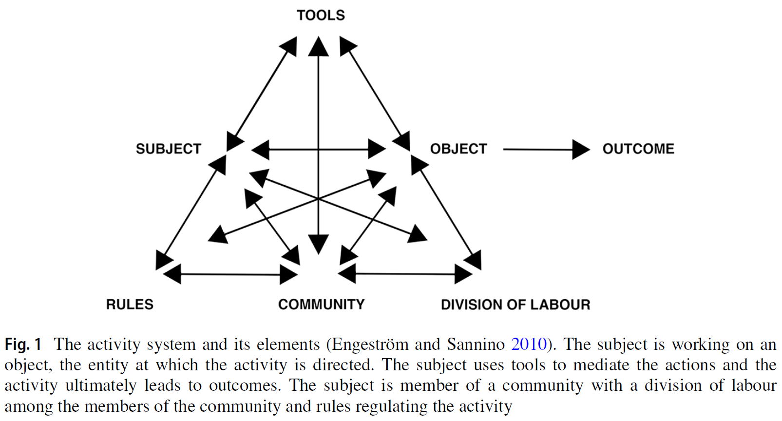 활동 시스템은 또한 [주체와 객체subject and object 사이의 상호작용]을 위한 [중재 도구]의 사용, 즉 [객체object의 달성을 위해 도구tool가 어떻게 주체의 작업을 중재mediate하는지]를 묘사합니다. 이러한 도구는 우리의 문화 역사 및 사회 환경에서 비롯되었으며, 일정과 같은 구체적이거나 언어 및 개념과 같은 추상적일 수 있습니다(Nicolini 2012). 이 주체subject는 [규칙이 활동을 규제하고, 분업division of labour이 공동체 내에서 어떻게 일을 분배하는지를 지정]하는 사회 문화 공동체의 일부이다. 모든 요소는 상호 연결되고 함께 주체의 목적 달성을 중재하거나 방해합니다.
