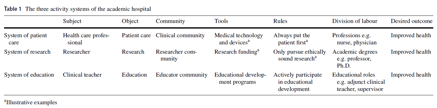 활동 이론에 따라 학술 병원의 활동을 환자 진료, 연구 및 교육 대상이 각각 지시하는 [세 가지 활동 시스템]으로 나누었다(표 1). 이러한 활동은 학술병원이 원하는 "건강의 향상"이라는 결과를 얻기 위해 결합된다. 임상 교사는 이 세 가지 시스템 중 몇 가지 또는 모두 대상이었지만 역할과 책임은 달랐다. 이하에서는, 이러한 시스템간의 모순에 대해, 그 모순과 중재자가 교육 활동에 어떻게 나타나는지에 대해 논의한다.