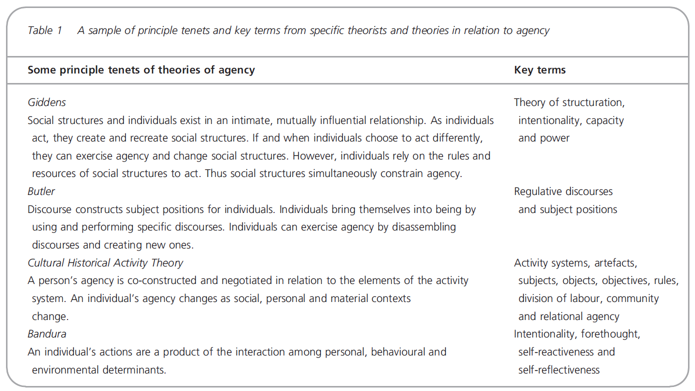 It is important to note that although Butler, Giddens, CHAT scholars and Bandura all construct theories of agency, they do so in different ways and using very different language. The focus of this paper is limited to the way in which theories of agency can provide new insights into wicked problems; we do not offer full explanations and applications of the complete body of work from any of these orientations, nor do we engage in debate about the different theories themselves. Rather, we focus specifically on concepts of individual agency drawn from these theories.