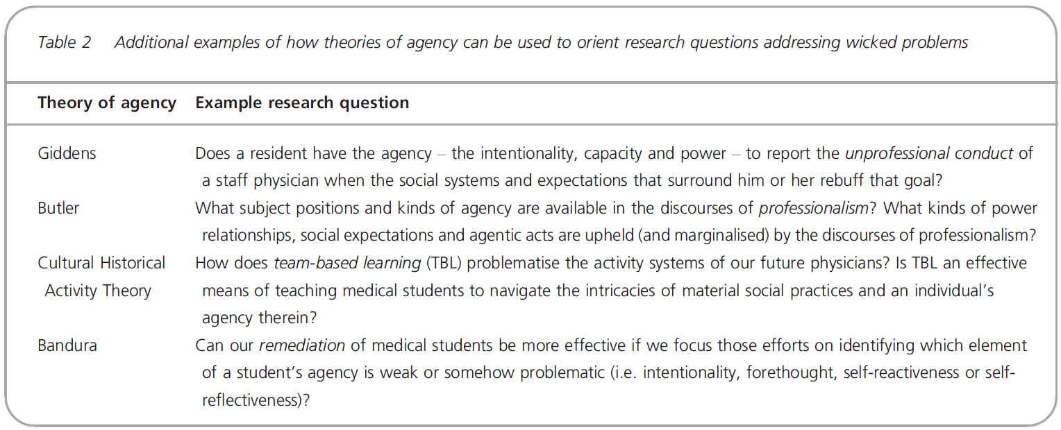 The role and value of theory in HPE scholarship has long been acknowledged.6, 71, 72 However, incorporating theory into our scholarly pursuits is difficult,73 especially when particular theoretical works are unfamiliar to the community. In this review, we introduce four different theories of agency that can usefully be applied to wicked problems. Although we have illustrated the application via IPE, we suggest that theories of agency can equally inform other wicked problems in HPE. Table 2 shows additional examples of the application of agency-informed research questions to other complex problems. Our intention is not to present the concept of agency as a panacea for all the challenges faced by HPE scholars and teachers. Instead, we believe that this review will offer scholars new ways of thinking about and studying the wicked problems challenging the HPE field.