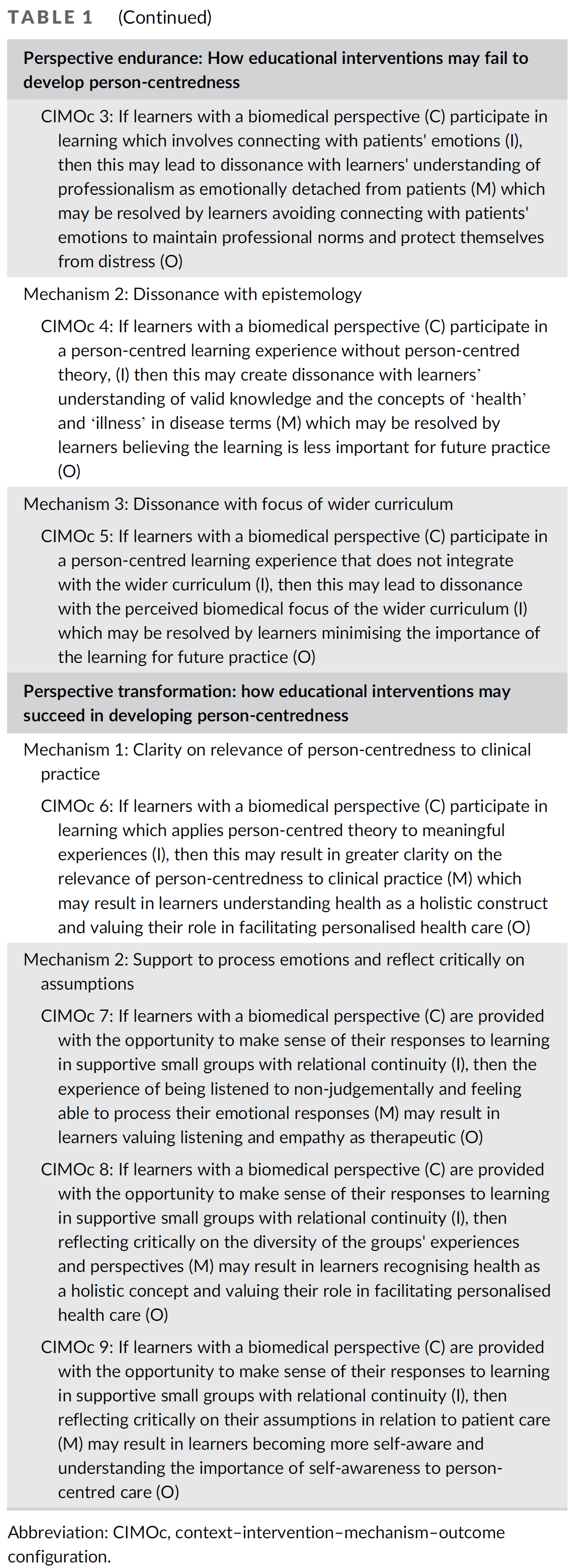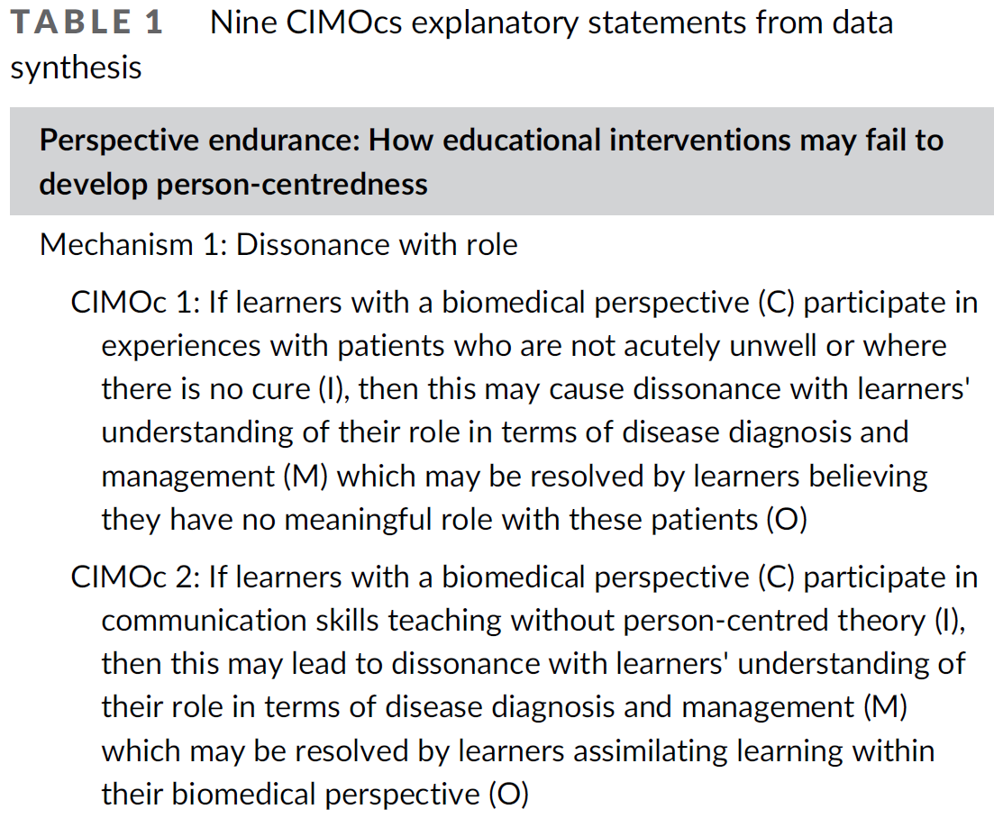 Several models are available for articulating theory configurations.36, 37 We found that separating the learner context from the educational strategy helped us to isolate the mechanisms leading to changes in perspective. We therefore chose to use the context–intervention–mechanism–outcome configuration (CIMOc) for our realist causal explanations. We grouped CIMOcs based on their outcome and working backwards were able to investigate the key features of the educational strategies that triggered the mechanisms leading to a change in person-centred perspective (or not) and so to construct an overall programme theory.