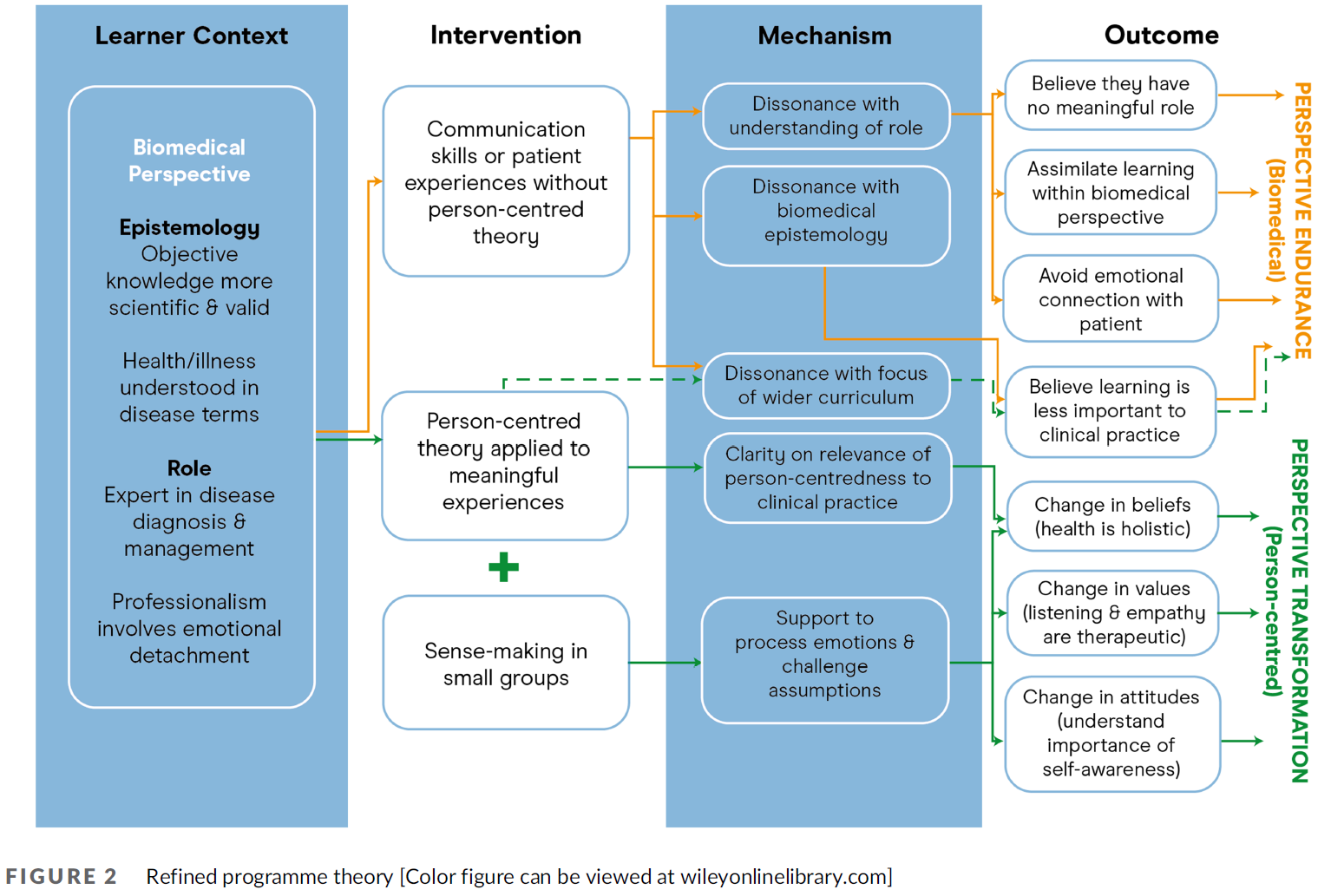 Results: Sixty-one papers representing fifty-three interventions were included in the final synthesis. Nine context-intervention-mechanism-outcome configuration (CIMOc) statements generated from the data synthesis make up our refined programme theory. Where educational interventions focused on communication skills learning or experiences without person-centred theory, learners experienced dissonance with their biomedical perspective which they resolved by minimising the importance of the learning, resulting in perspective endurance. Where educational interventions applied person-centred theory to meaningful experiences and included support for sense making, learners understood the relevance of person-centeredness and felt able to process their responses to learning, resulting in perspective transformation towards person-centredness.