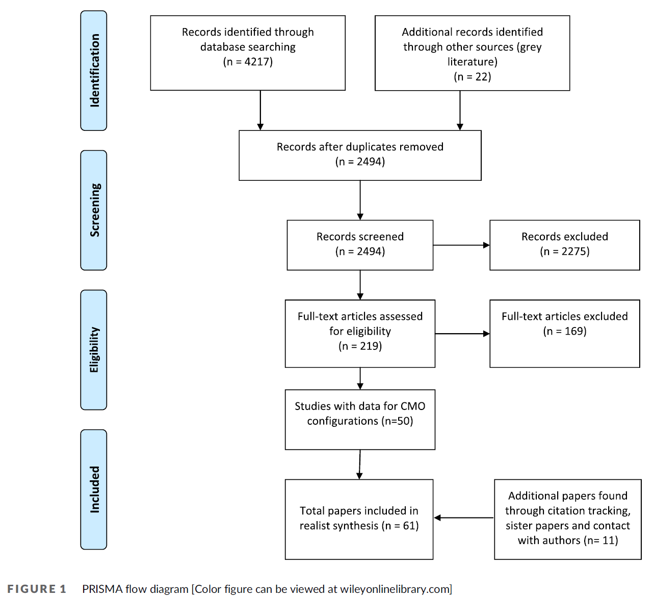 초기 검색 결과 4217개의 결과가 나왔다. 그림 1은 최종 현실주의 합성에 61개의 논문 또는 문서가 포함되게 된 필터링 과정을 보여줍니다. 8개의 논문이나 문서가 같은 '개입'을 보고 있었기 때문에 교육개입이 53개였다.