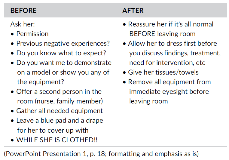 Everything that is going to happen during the pelvic examination should be explained before it occurs. (Beckmann, p. 11; emphasis added)