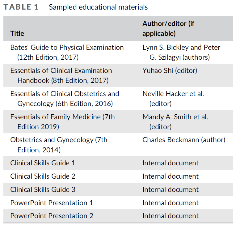 This study investigates text- and visual-based learning materials on how to perform the PE in undergraduate medical school curricula. Materials such as these serve as the first introduction students have to the PE and form the foundation through which they later perform the procedure. Analyses of such materials provide important insight into the technical information given to thousands of medical professionals,60 and messages therein may impact students' long-term beliefs and perceptions in medicine.60, 61 Through a situational analysis of critically sampled documents, this study aims to fill a knowledge gap in medical education and provide information on if and/or how text- and visual-based PE learning materials could be improved upon to include more patient-centred and culturally competent approaches that may be lacking in later clinical learning.