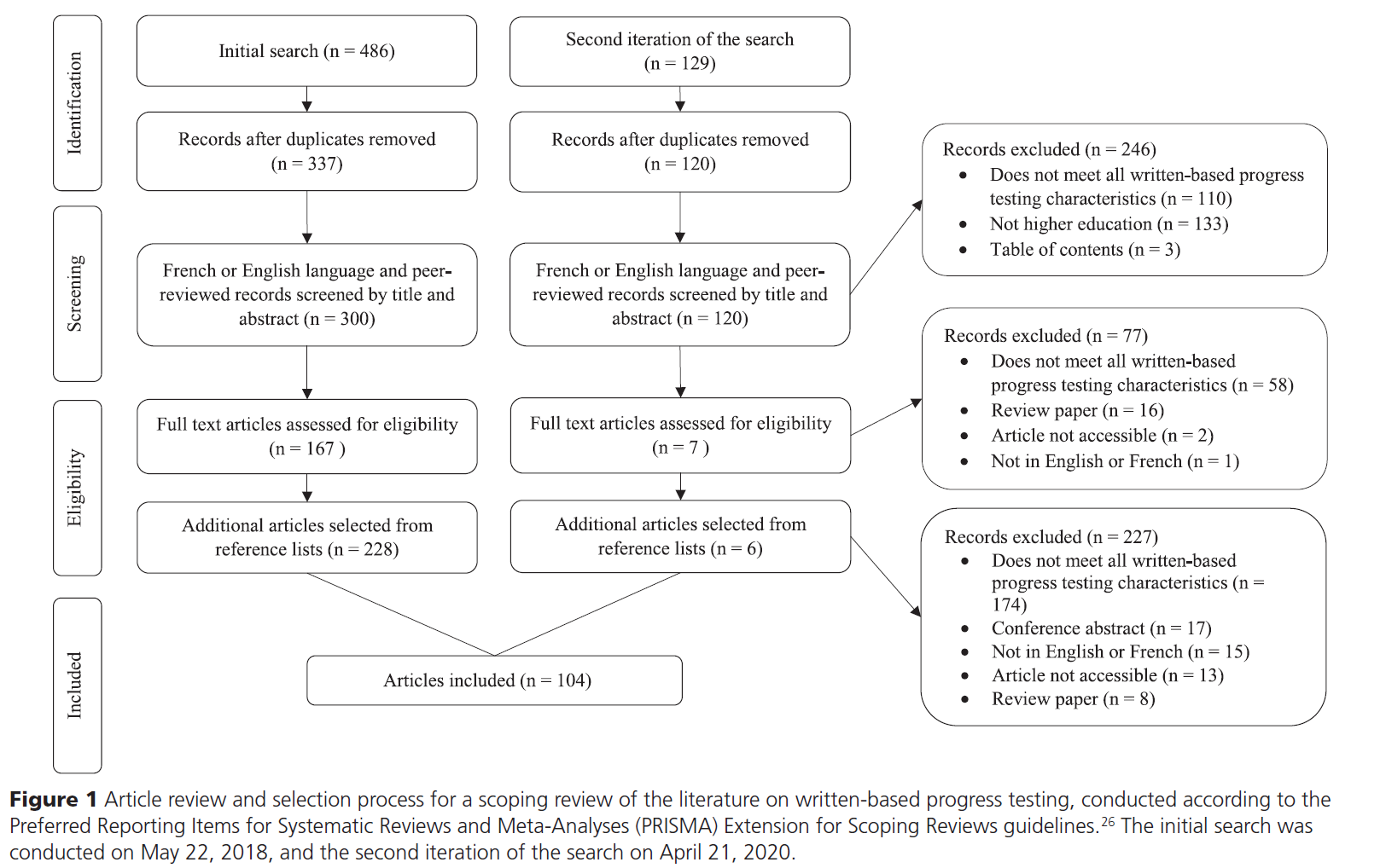 연구팀은 기존 Progress 테스트의 3가지 주요 특징(즉, 종방향, 단면 및 포괄적)을 가진 평가를 기술한 기사를 포함했다. 우리는 필기 진도 시험과 고등교육의 맥락에서 연구와 관련된 기사만을 포함했다. 영어나 프랑스어로 쓰여진 기사도 포함되어 있었다. 우리는 경험적 연구와 서면 Progress 테스트에 대한 1차 참조의 연구뿐만 아니라 동료 검토 기사를 포함했다. 우리는 지식 종합(리뷰), 사설, 목차, 회의 요약 및 주석 기사를 제외했다.
