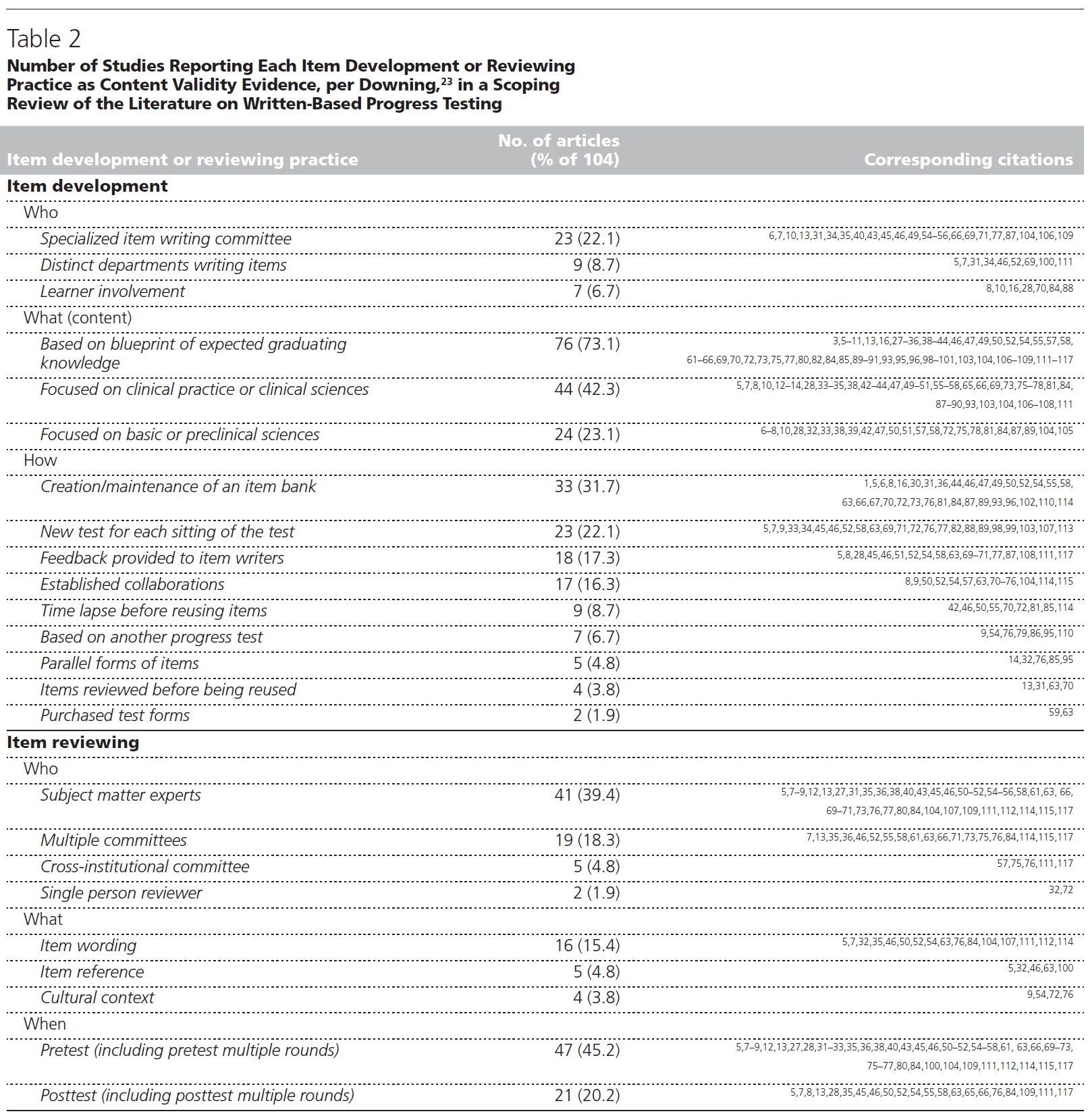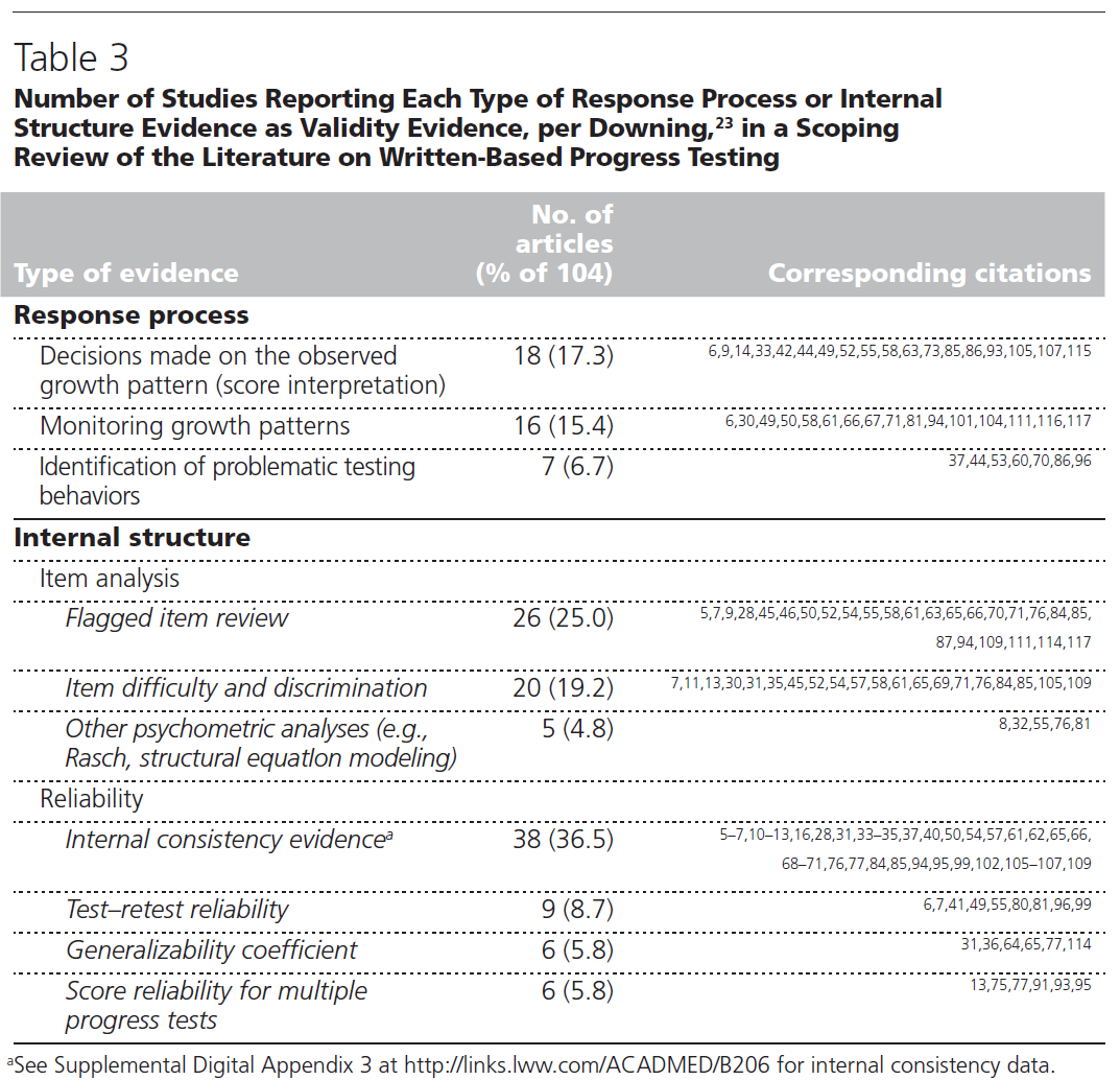 [다른 변수와 관련된 근거]에 [progress tests 점수와 전문가로서의 미래역량 사이에 정량적 상관관계]와 질적 연관성이 나타났고, 졸업시험(9·8.7%), 교육과정 내 기타평가(13·12.5%), 기타학교 진도검사 점수(8·7.7%)가 나왔다. 20개 조항(19.2%)이 사용된 명시적 표준 설정 방법을 보고했다.