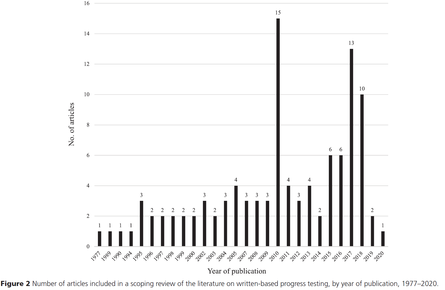 There are certain limitations to this scoping review. We did not assess the quality of the articles included in our study, which is consistent with the socioconstructive underpinnings of a scoping review, the goal of which is to capture the breadth and depth of the literature on a given topic. 131 Based on the study design, the main goal of this scoping review was to map broadly and deeply the literature on progress testing rather than assess the quality of articles. Finally, the results may be skewed by the over representation of articles from the Netherlands in our sample. This was expected as they contributed to the development of this assessment strategy and are, as illustrated in our descriptive analysis, fervent users of progress testing.