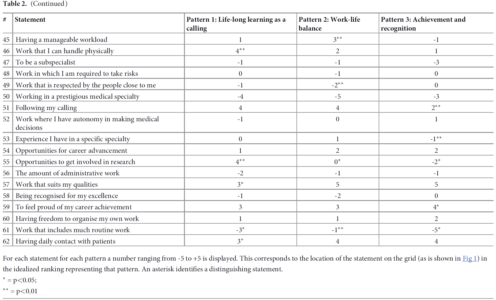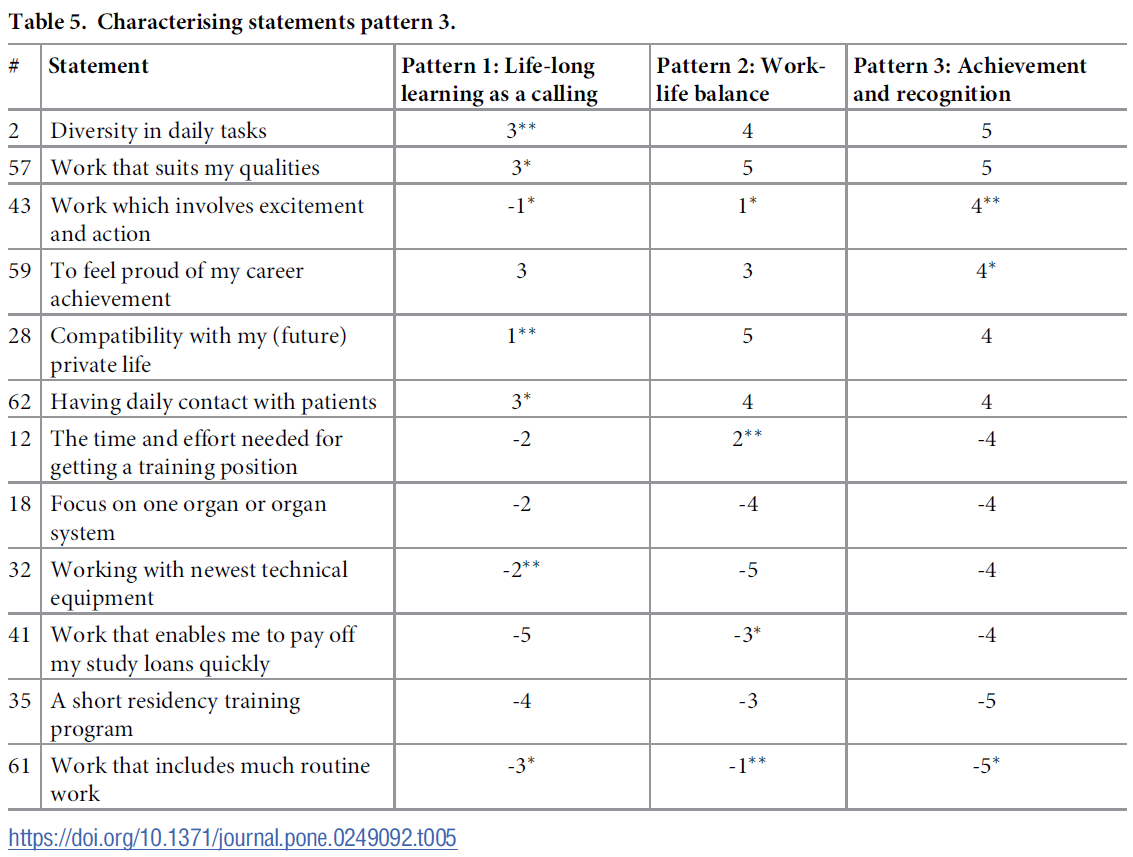 These idealized rankings are then interpreted as distinct career orientations among medical students. Interpretation of each pattern starts by the characterising statements, those with a +5, +4, -4 or -5 score in that pattern, and the distinguishing statements, those with a statistically significant different score (p<0.05) in a pattern as compared to the other patterns. However, a pattern consists of all 62 statements and it is the interrelationship of the many items that ultimately drive our interpretation.