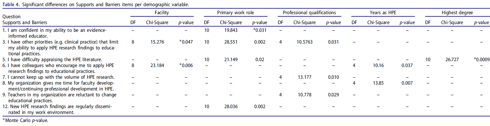 직무역할과 전문자격만을 기준으로 업무환경 내에서 자신감, 경쟁우선순위, 비판적 평가능력, HPE 연구의 유용성 등의 요소에 유의한 차이가 있었다. 임상의는 증거에 정통한 교육자가 될 수 있는 능력에 대해 가장 자신감이 없었고, 다역할을 하는 사람들은 연구가 주된 책임인 참여자에 비해 더 자신감이 있었다. 임상의는 여러 역할을 가진 사람(연구가 있거나 없거나)보다 시간 제약이 많다고 보고했다. 연구, 행정 및 교육을 포함하는 책임이 있는 개인(즉, 다중 역할)도 교사 및 연구자에 비해 시간 제약이 더 많다고 보고했다. 의학박사와 비임상사는 HPE 연구 결과를 교육 관행에 적용할 수 있는 능력을 제휴 의료 전문가와 비교하여 현저하게 제한하는 다른 우선 순위를 가지고 있다고 보고했다. MD들은 일반적으로 (AHP나 비임상인에 비해) 자신이 소속된 조직의 교사들이 교육 관행을 바꾸는 것을 꺼린다는 데 동의할 가능성이 더 높았다.