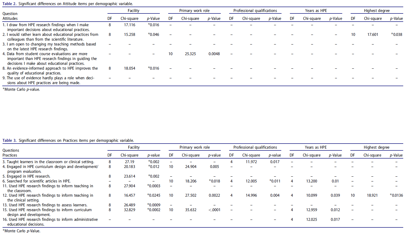 Tables 2–4 contain the statistically significant chi-square values for items within each of the three sections based on (1) type of setting at which participants work; (2) primary work role; (3) professional qualifications; (4) years of experience as a HP educator; and (5) highest degree obtained.