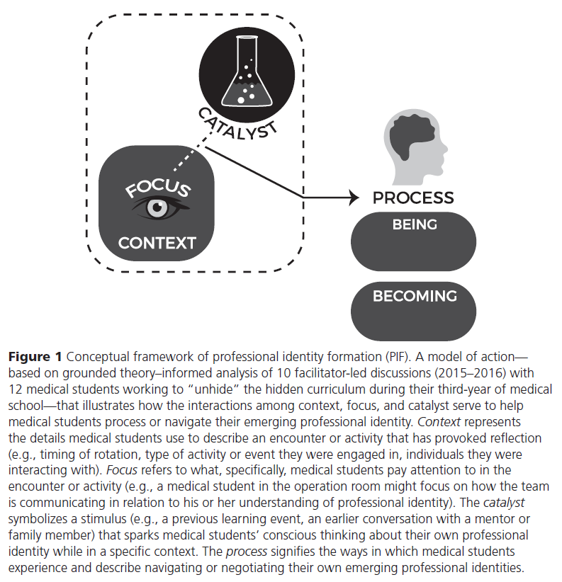 학생들은 종종 특정한 [촉매]가 어떻게 그들이 특정한 맥락과 집중 안에서 그들 자신의 정체성에 대해 반성하고 자기성찰하도록 자극하는지 묘사했다. 예를 들어, 학생은 수업 시간에 전문성에 대한 강의를 들을 수 있었고, 그것은 임상 학습 렌즈가 아닌 PIF 렌즈로 OR 팀의 대화를 볼 수 있는 촉매제가 되었을 수 있다. 즉, 학생은 어떤 관련 환자 정보가 제시되고 있는지가 아니라 "이 상황에서 나는 누구인가?" 또는 "나는 미래에 어떻게 되는지에 대해 무엇을 배우고 있는가?"라고 생각한다.