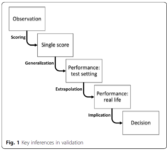 Kane의 최신 유효성 프레임워크는 평가 활동에서 4가지 주요 추론을 식별함으로써 우선순위 부여 문제를 다룬다(표 3). 고전적 또는 5가지 증거 소스 프레임워크에 익숙한 사람들에게 케인의 프레임워크는 용어와 개념이 완전히 새로워 처음에는 종종 도전적이다. 사실, 이 프레임워크를 학습할 때, 우리는 이전 프레임워크의 개념과 일치하려고 시도하지 않는 것이 도움이 된다는 것을 발견했다. 오히려, 우리는 모든 평가 활동에 관련된 단계들을 개념적으로 고려하는 것으로 혁신을 시작한다.