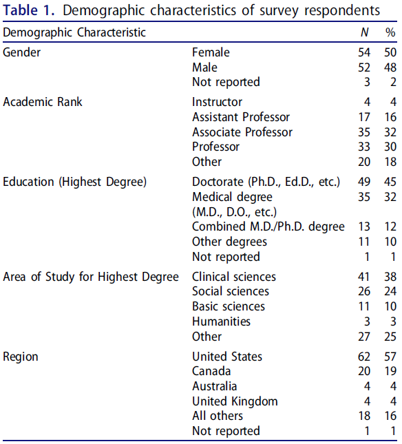 응답자들은 평균 19년(SD = 11.1년) 의학교육 경험(Mdn = 16.5년)을 보고하였다. 그들은 지난 2년 동안 의료 교육에서 4.5개의 동료 평가 출판물(Mdn = 3, 모드 = 2)을 보고했다. 응답자 특성 요약은 표 1에 제시되어 있다. 연구 분야별로는 임상(38%, n=41), 사회과학(24%, n=26), 기초과학(10%, n=11), 인문(3%, n=3), '기타'(25%, n=27) 순이었다. 연구 분야가 교육인 일부 응답자들은 자신을 사회과학 분야로 분류한 반면, 다른 응답자들은 "기타"라고 말했다. 응답자의 절반 이상(57%, n=62)이 미국 출신이어서 본 연구의 표본 추출과 일치한다. 1차 조사 응답자와 3차 조사 응답자의 인구통계학적 특성을 비교한 결과, 수년 간의 의료 교육 경험, 지난 2년 동안의 동료 검토 간행물 또는 표 1에 나열된 속성과 관련하여 유의미한 차이가 발견되지 않았다(p > 0.05).