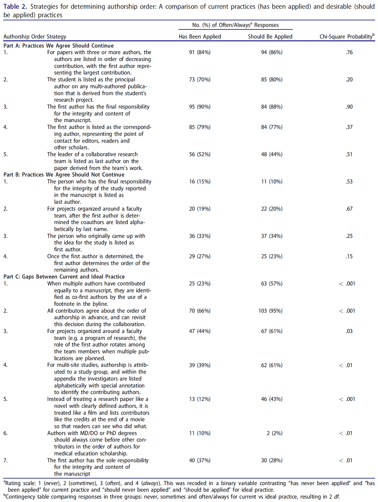 많은 응답자들은 모든 저자를 기여도에 따른 내림차순으로 하되 시니어 저자를 마지막에 뒀고(43%), 알파벳 순서(2%), 또는 가장 고위 저자에 대한 내림차순(2%)에 따라 내림차순을 나열하는 것에 비해, 마지막에 나열된 상위 저자에 대한 내림차순(51%)을 선호했다. 비록 두 개의 상위 승인 전략이 기여도에 따른 내림차순의 사용을 지지하지만, [마지막 저자 지위]의 중요성은 다시 의학교육계를 분열시켰다.