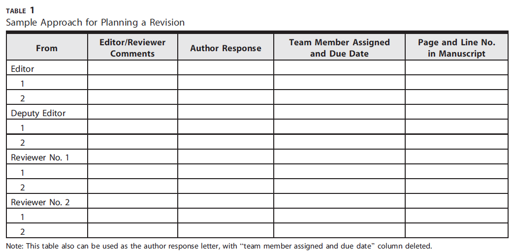 Often the lead author writes the entire revision and author response letter, but comments and sections may also be divided among the group, to distribute the workload. To facilitate planning, the lead author can create a comment and response table (see table 1), which includes every editor and reviewer comment. Coauthors may be assigned a specific response/revision task, along with a deadline for completion. When revising, changes can be tracked with track changes. If a team approach is used, it is essential that the lead author read the final product carefully, to ensure consistency and accuracy.