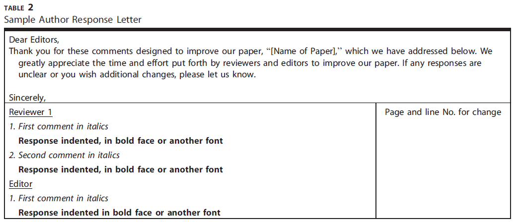 Each year editors read thousands of papers and even more revisions. Make your author response letter crystal clear—as clear yet as brief as possible. Make the comments, response to comments, and location of changes in the manuscript easy to visualize by using a table approach (table 1) or different fonts or colors, to differentiate comments from responses and manuscript changes (table 2). If the journal provides a template in the author instructions for the author response letter, follow the template closely.