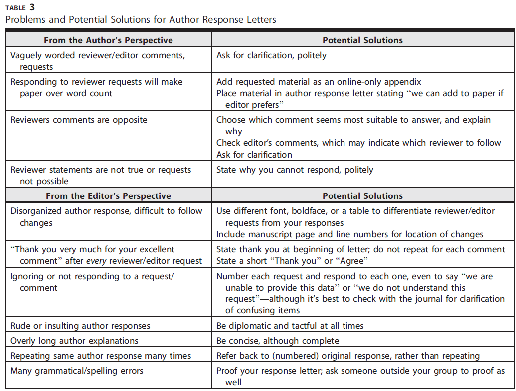 Sometimes reviewers request additional information or tables that will make the paper go over word count or graphics limits. If there are no other areas in which to trim words, it is best to provide the requested information in the author response letter rather than in the manuscript. Depending on the journal, additional information can be placed in online-only appendices. Alternatively, authors can provide the requested answers in the response letter and state that this information can be added to the paper, if the editors prefer. Do not use “we cannot respond as it will put the paper over the word count limit” as a reason for nonresponse. See table 3 for tricky reviewer and editor comments and potential solutions for authors.