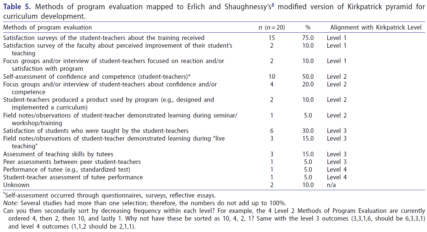 개입은 평가를 수행하기 위해 설문 조사, 포커스 그룹, 인터뷰, 성찰 에세이를 포함한 다양한 방법을 사용했다. 표 5는 중재에 의해 사용되는 13가지 평가 방법의 보급률을 보여준다. 프로그램 평가 방법을 커크패트릭의 프로그램 평가 수준에 대한 에를리히의 수정된 버전으로 도표화한 후, 도달한 최고 수준을 기준으로 20개 개입을 4가지 수준의 프로그램 평가로 분류했다: 수준 1(n = 3, 15%), 수준 2(n = 9, 45%), 수준 3(n = 5, 25%), 수준 4(n = 3, 15%), 미지(n = 2, 11.8%).