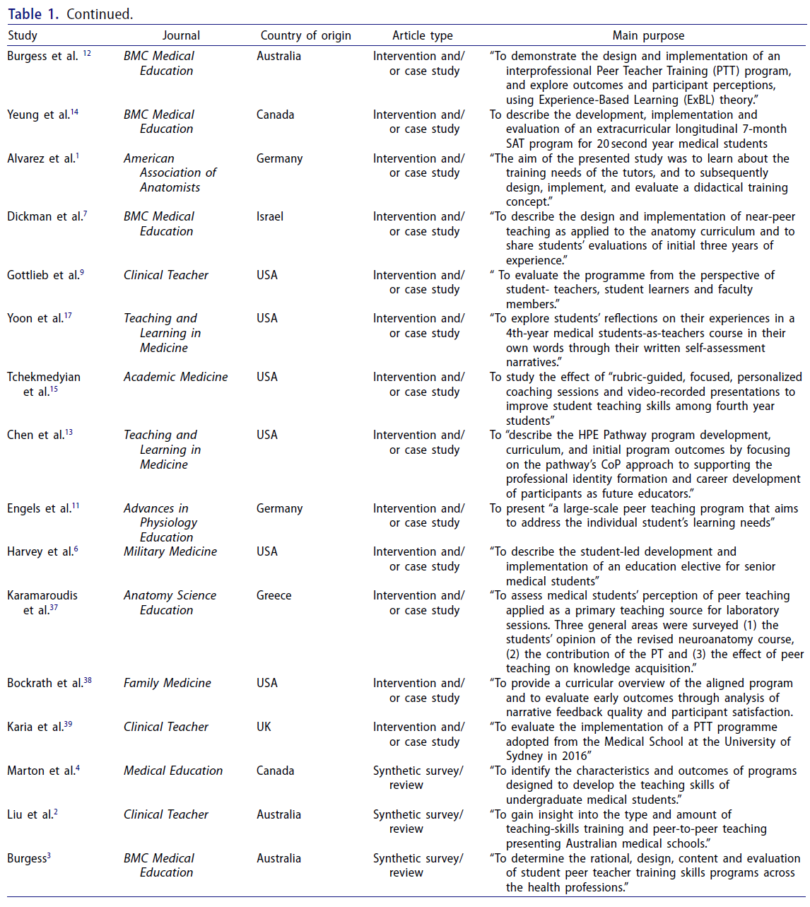1990년에서 2013년 사이에 발표된 기사를 포함한 Marton 등의 4개 리뷰를 연장하고자 했기 때문에 의대생을 포함하지 않았거나, 영어로 작성되지 않은 논문는 제외했다. 검색은 2014년 이후에 출판된 기사로 제한되었다. 또한 튜터를 위한 교육학적 훈련이 없는 동료 튜터링에 초점을 맞춘 기사 및 가르침과 직접적인 관련이 없는 전문 기술(예: 커뮤니케이션, 리더십, 피드백)에 초점을 맞춘 기사는 제외했다. 마지막으로, 여러 출판물에 대한 개입을 위해, 우리는 더 최근의 출판물에 의해 대체된 결과가 있는 연구를 제외했다.