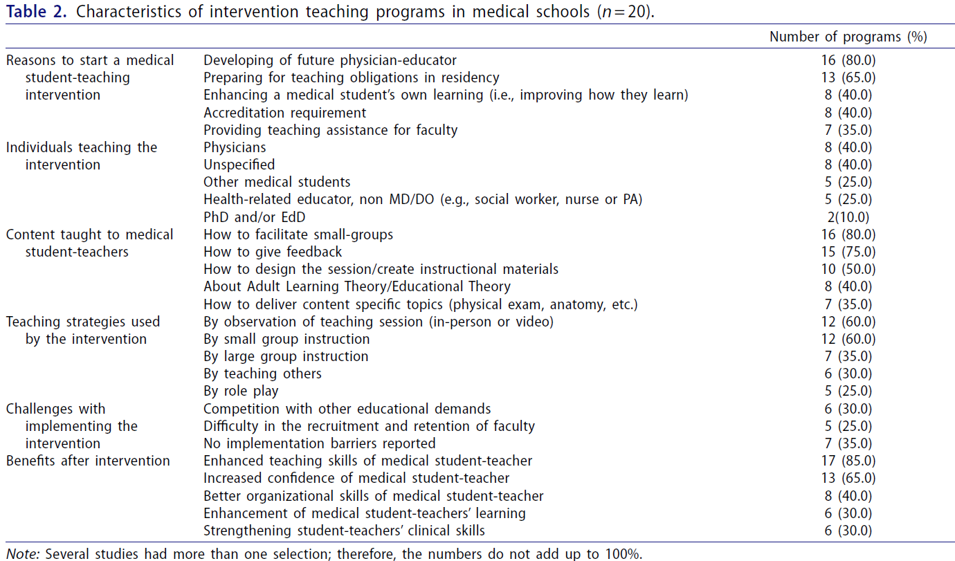 새로운 프로그램의 성장을 촉진하고 기존 프로그램에 대한 실습에 대한 공유 지식을 제공하기 위해 의대생들에게 가르치는 방법에 대한 문헌 검토가 필요하다. MSAT 또는 니어피어 튜터링 프로그램은 [교수 역량 향상]과 [가르침teaching이 의사의 중심 업무임을 인식하게 함]을 포함한 다양한 혜택과 관련이 있다. 그 프로그램들은 가르치는 법을 배우는 사람들과 의대생-선생님이 가르치는 사람들- 의대생들에게 모두 혜택을 준다. 의료계 종사자들에게, 교육에 대한 노출은 평생의 교육 문화, 강화된 의사소통 기술을 통한 환자 치료 개선, 그리고 교육자 역할에 더 잘 준비된 노동력으로 이어질 수 있다. 기관은 교직원이 채우지 못하는 교육과정 내 격차를 해소하는 등 교직원의 교육부담 완화를 도모할 수 있다1. 의대생들의 경우, 교수 기술 훈련을 받는 사람들은