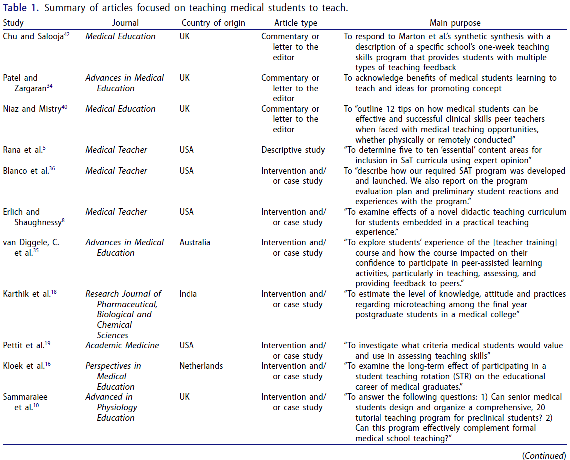 의과대학은 의대 학생들, 특히 더 많은 상급생들에게 교사가 되기 위한 지식과 기술을 제공하기 위한 노력을 증가시켰다. 이러한 교사로서의 학생 프로그램은 종종 근거리 교육 프로그램의 형태로 제공되지만, 또한 학생들이 상주 교사, 환자 교육자 및 임상의-교육자로서의 역할을 준비하도록 설계된 보다 집중적인 과정을 포함한다. 이 범위 검토는 문헌이 [객관적인 교육 프로그램 평가에 대한 요구에 답하기 시작했다는 것]을 입증함으로써 Marton 등이 2014년에 발표한 이전 검토에 기초한다. 그러나 증거의 품질을 결정하기 위해서는 향후 체계적인 검토가 필요하다. 함께, 이러한 연구는 의대 학생들에게 제공되는 교수 기술과 기회를 확대할 것이다.
