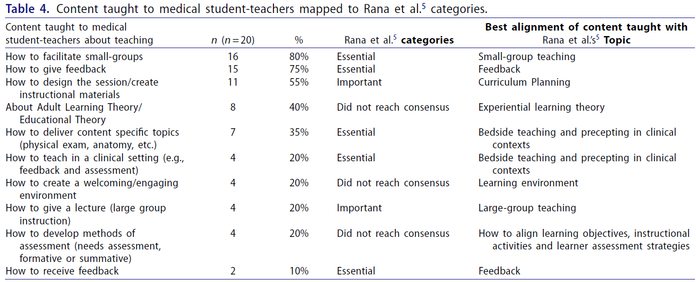 We found that 80% (n = 16) of interventions reported providing medical student-teachers with feedback at least once. Twelve interventions (60%) described peers and/or learners in the program providing feedback to the medical student-teachers. These areas of focus create practical lessons that are essential for programs to ensure teaching interventions maximize effectiveness.