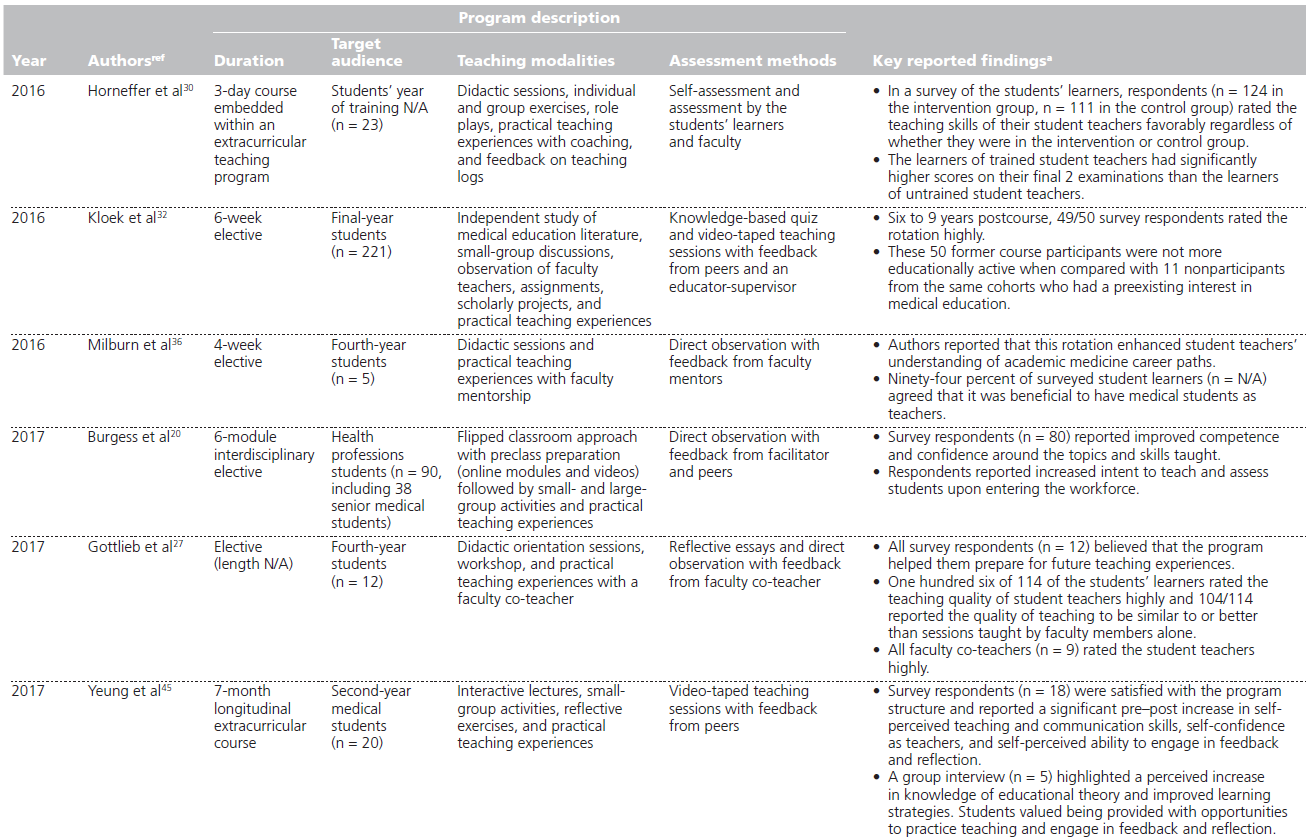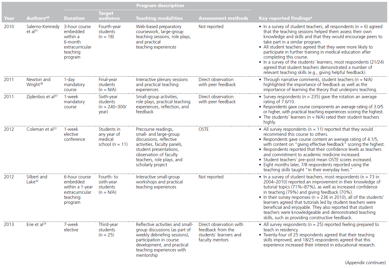 These findings align with those of the 3 review articles identified in this narrative review, 3,9,10 whose most commonly reported outcomes included high student satisfaction and self-perceived improvement in teaching skills following course completion. These reviews also highlighted the need to better evaluate curricular outcomes, including assessing students’ teaching skills.