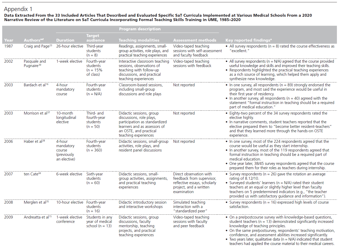 부록 1에 요약된 바와 같이 공식 교수 기술 교육을 제공한 33개의 발표된 SaT 커리큘럼을 검토할 때 유사한 결과가 확인되었다. 이러한 커리큘럼의 대부분은 상급 의대생(25/33)을 위해 개발되었으며, 본질적으로 선택 사항(27/33)이었다. 대부분의 커리큘럼은 [짧은 과정]으로 설명되었지만, 7개의 커리큘럼은 종단적인 경험으로 개발되었습니다. 이러한 종적 교육과정 중 2개는 의과대학 4년 전 과정에 걸쳐 진행되었으며, 나머지 5개는 3개월에서 2년까지 다양한 기간에 걸쳐 실시되었다. 저자들은 종단적인 과정 전달을 학생들이 과정 내용을 더 잘 동화시키고, 교수 기술을 연습하며, 교사로서의 역량을 키울 수 있는 유용한 전략으로 설명했다. 중요한 것은, 모든 저자들이 의대 학생들의 교사로서의 역할에 대한 준비를 강화할 필요성을 강조했다는 것이다.