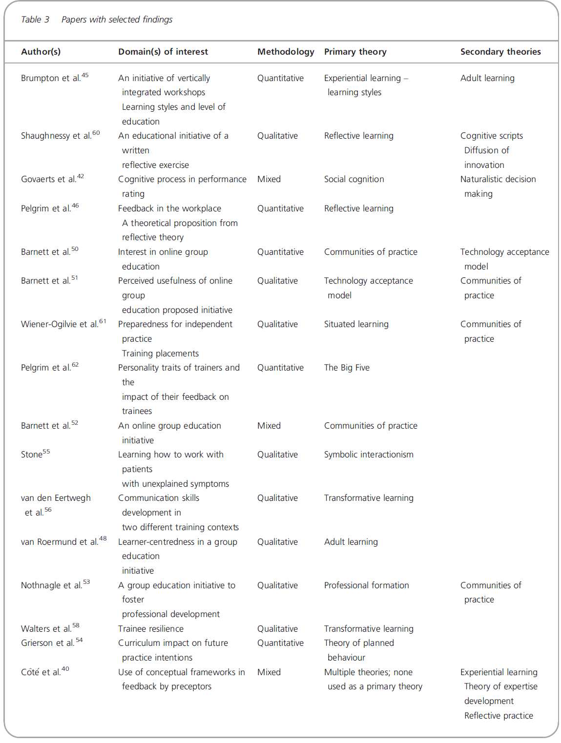 사용된 이론을 확인한 후, 우리는 이것을 의학 교육에서 취해진 세 가지 이론적 관점에 대한 Bleakley 외 연구진의 유형론으로 분류했다.