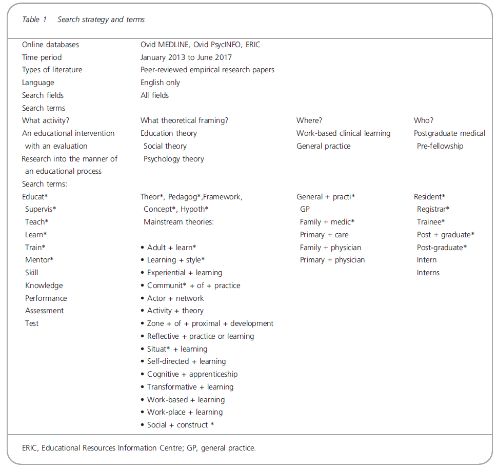 우리는 논문을 선정하기 위해 PRISMA(체계적 검토 및 메타 분석을 위한 선호 보고 항목) 지침을 따랐다(그림 1). 표 1에 자세히 나와 있는 검색어를 이용하여 Ovid MEDLINE, Ovid PsychINFO, ERIC(Educational Resources Information Center)를 검색하였다. 이 용어들은 GP 대학원 직업교육에서 이론을 명시적으로 언급한 발표된 연구 논문을 캡처하기 위해 고안되었다. 우리는 2013년 1월부터 2017년 6월까지 발표된 논문으로 검색을 제한했다. 검색어를 식별하기 위해 의학교육에서 이론 사용에 관한 최근 출판물에서 사용된 '이론' 용어를 살펴보았다. 우리의 기준을 충족시키는 알려진 논문들이 검색의 적절성을 판단하는 데 사용되었다. 팀(JB, MB, CK, EM, DC 및 DN)은 의도된 문헌에서 논문을 수집하는 목적을 달성할 수 있는 포함 및 제외 기준을 개발하기 위해 논문의 선택을 읽었다. 제외 기준은 그림 1에 자세히 설명되어 있다. 우리는 이론이 [교육 개입의 내용]만을 프레임하고, [개입의 교육적 과정]을 프레임하지 않기 위해 사용된 경우 그 논문을 제외했다. PRISMA 지침에 따라 두 명의 연구원(JB와 CK)은 제목별로, 추상별로, 그리고 나서 전체 논문을 읽음으로써 논문을 선별했다. 논문 포함에 대한 합의가 이뤄지지 않은 상황에서 연구팀(MB)의 제3의 멤버를 투입해 최종 결정을 가능하게 했다.