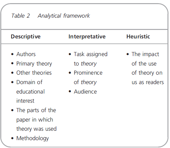 Our analysis was undertaken from interpretivist and constructivist perspectives.35 We built an analytic framework iteratively as we interacted with the data and developed our conceptualisation. Our categories were developed using a synthesis of both deductive and inductive inquiry:37 our development of categories was framed by our questions, and informed by our reading of recent literature on the role of theory in education research and by the way theory was represented in our selected papers. We first read six papers and, as a team, developed an initial list of analytic categories. These categories were descriptive, interpretative and heuristic and were refined over a series of nine meetings informed by our progressive analysis of the data and by the areas of expertise we each brought. The component parts of our final analytic framework are detailed in Table 2. Each paper was analysed by at least two of the team; JB analysed all papers except two that he had authored.