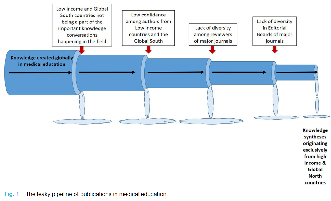 [누출성 파이프라인] 은유는 학계[1]와 STEM(과학, 기술, 공학, 수학) 분야[2]에서 여성의 대표 부족과 의학뿐만 아니라 학계에서도 유색인종의 부족을 설명하기 위해 사용되었다[3]. 새는 파이프라인 은유는 의학 교육 출판 관행과 아름답게 들어맞는다. 의학 교육에 대한 지식은 전 세계적으로 생성되지만, 그 분야의 시스템적 요소 때문에 특정 유형의 지식만 출판되고 그 분야에 보탬이 되는 '지식'으로 인정된다. 그림 1에서는 [글로벌 남방]으로부터의 지식이 상실되어, [글로벌 북방] 의학 교육 연구 저장고에 도달하거나 통합되지 않는 지식 파이프라인의 여러 가지 점을 설명한다.
