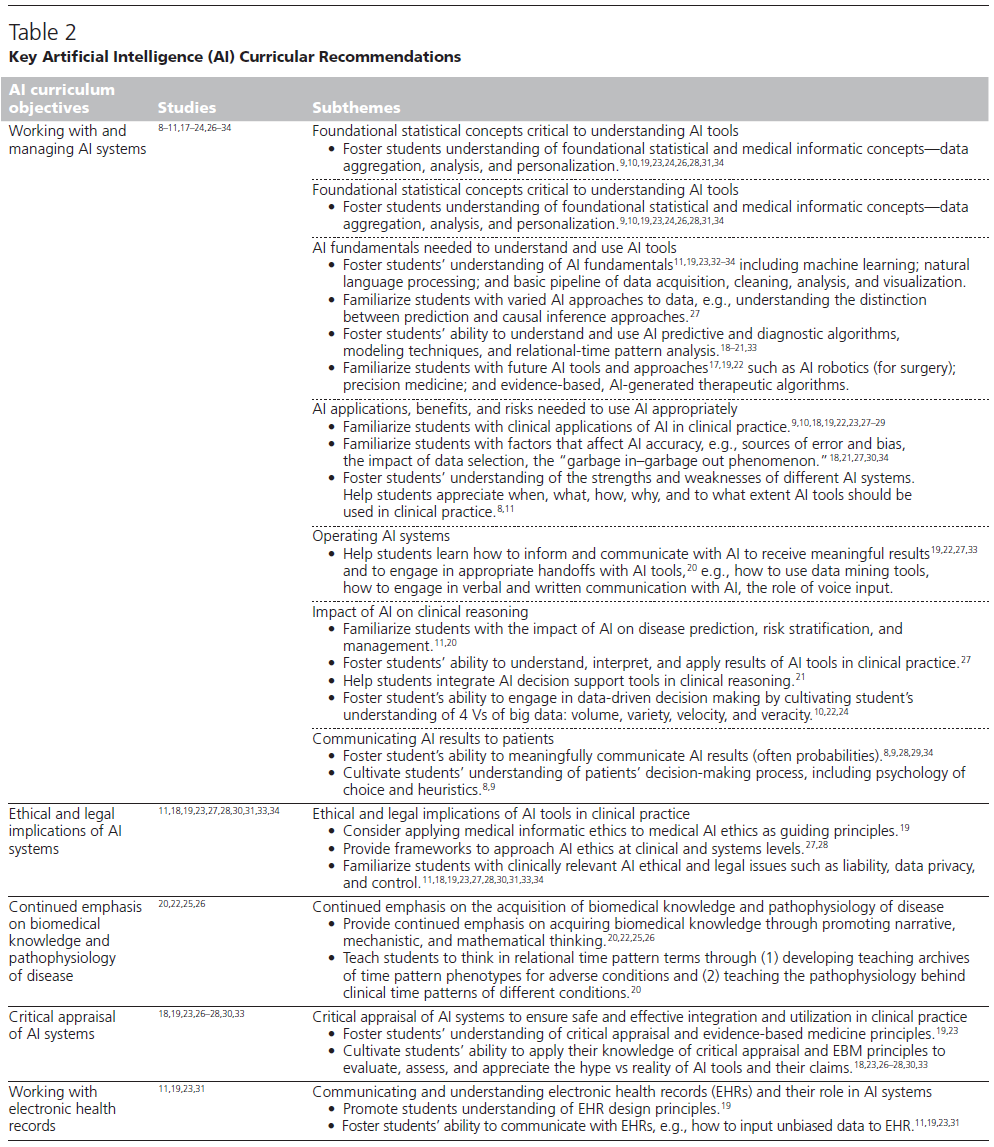 All 22 articles included in this review identified a need to prepare medical students for the integration of AI into medicine and put forth recommendations for an AI curriculum. While common themes emerged, inconsistencies between recommendations were noted. For example,